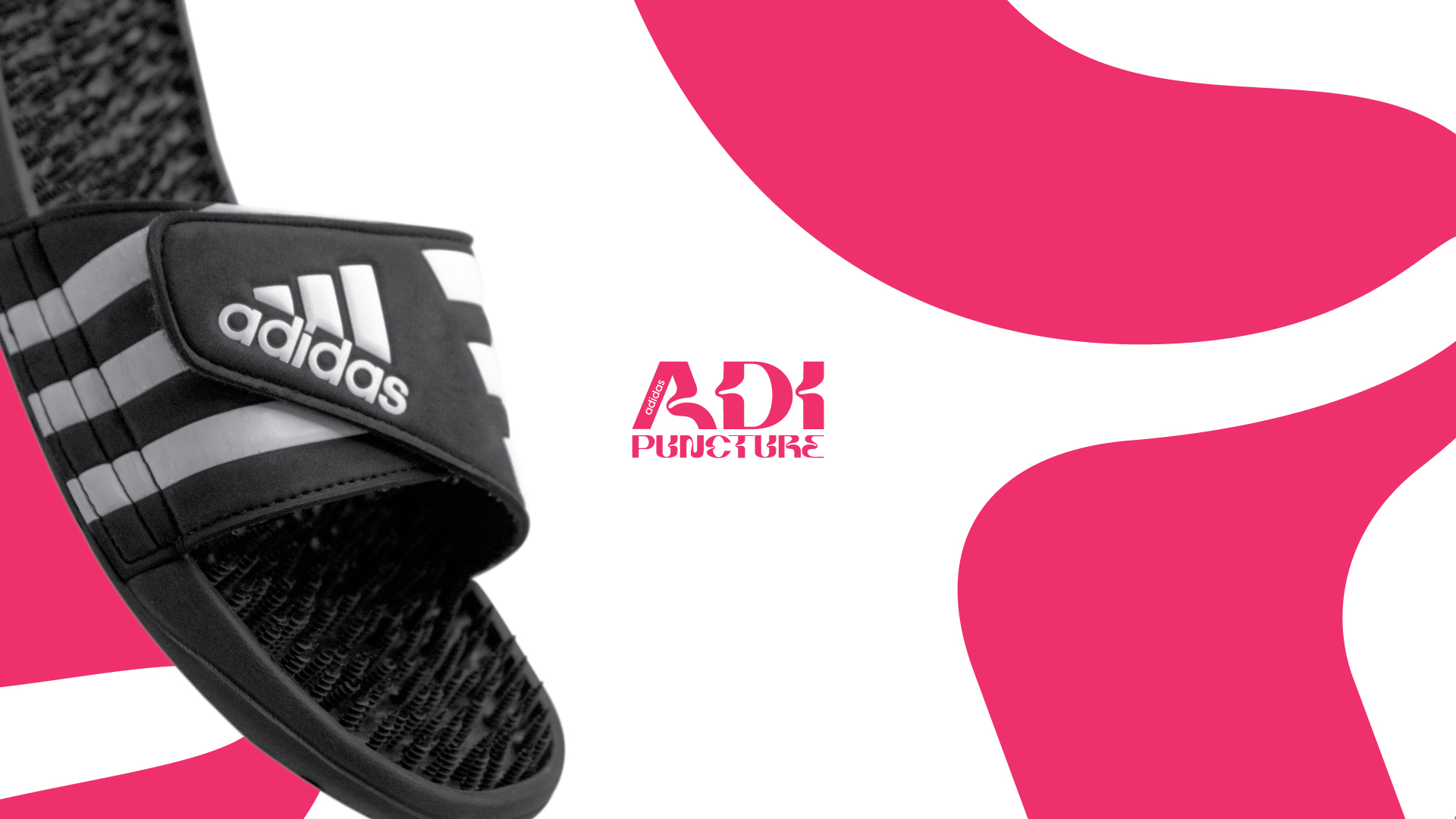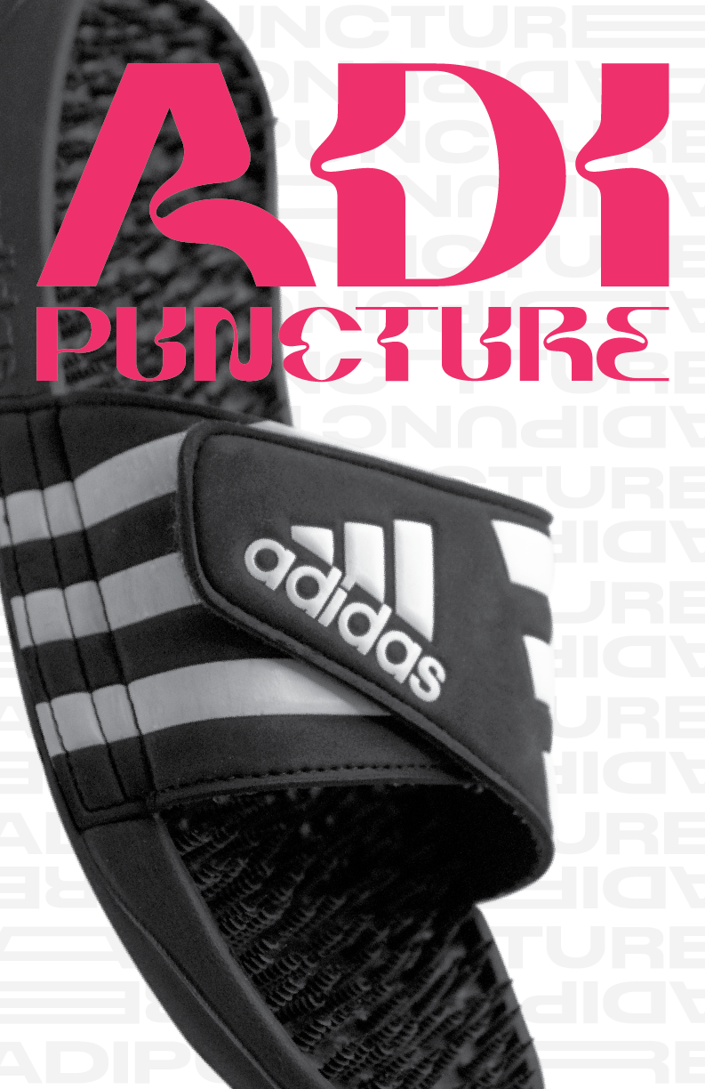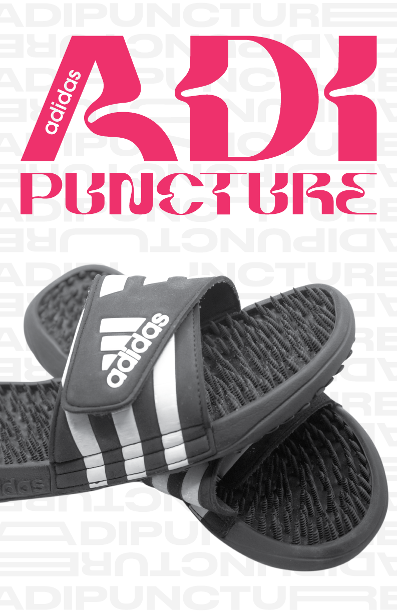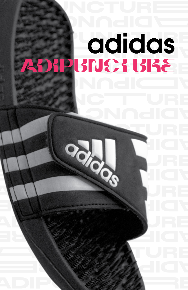 Adidas Adipuncture is a sibling of the Adidas Adissage slide-on shoes. The original slides are black with signature Adidas white stripes and logo, with small rubber stems on the part that contacts the bottom of one’s foot, with the intention of “massaging” the foot. The Adipuncture is designed to convince a viewer that there is a new version of the famous slides that instead promote the benefits of acupuncture rather than massage. While the original shoes have silicone stems, these shoes have pointed screws inserted into them that will poke into the foot of the wearer. The product claims to have the energizing benefits of acupuncture, a preexisting treatment from Chinese culture that is often categorized as “quackery”. The concept of selling shoes relies on the need for people to buy them. In order to get people to want to buy the shoes, branding and advertising become extremely important. Alongside the physical pair of shoes, I created a commercial, social media account, and a website to advertise them and their benefits. These were all created by mimicking the brand identity of Adidas in order to truly convince the viewer that they are a real product of Adidas, and that they will actually ‘work’. The website includes a shopping section for Mens, Womens, and Kids sizes of the shoe, as well as a video that promotes the benefits of the shoes for one’s health and fitness. The website also includes a gallery view and link to the social media account for the shoes, which displays nine social media advertisements of the shoes.