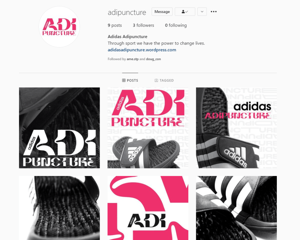 The website was created using similar components to the Adidas brand, such as the black and white color palette and sans serif type. In addition to this, I replicated the tabs of shopping categories and the order they appear in, to create a site that appears to be the Adidas shopping page. The front page displays the advertisement video, and below it is a gallery that shows the posts on the Instagram page. Each post for the Instagram page is a different poster advertising the Adipuncture shoes, including the Adipuncture logotype and images of the shoes themselves, creating dynamic compositions in each of them that could be applied to this brand and type of product.