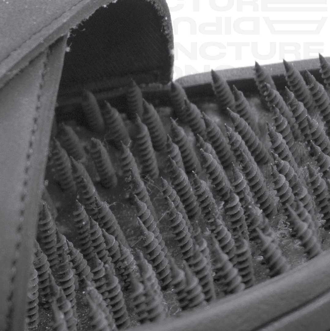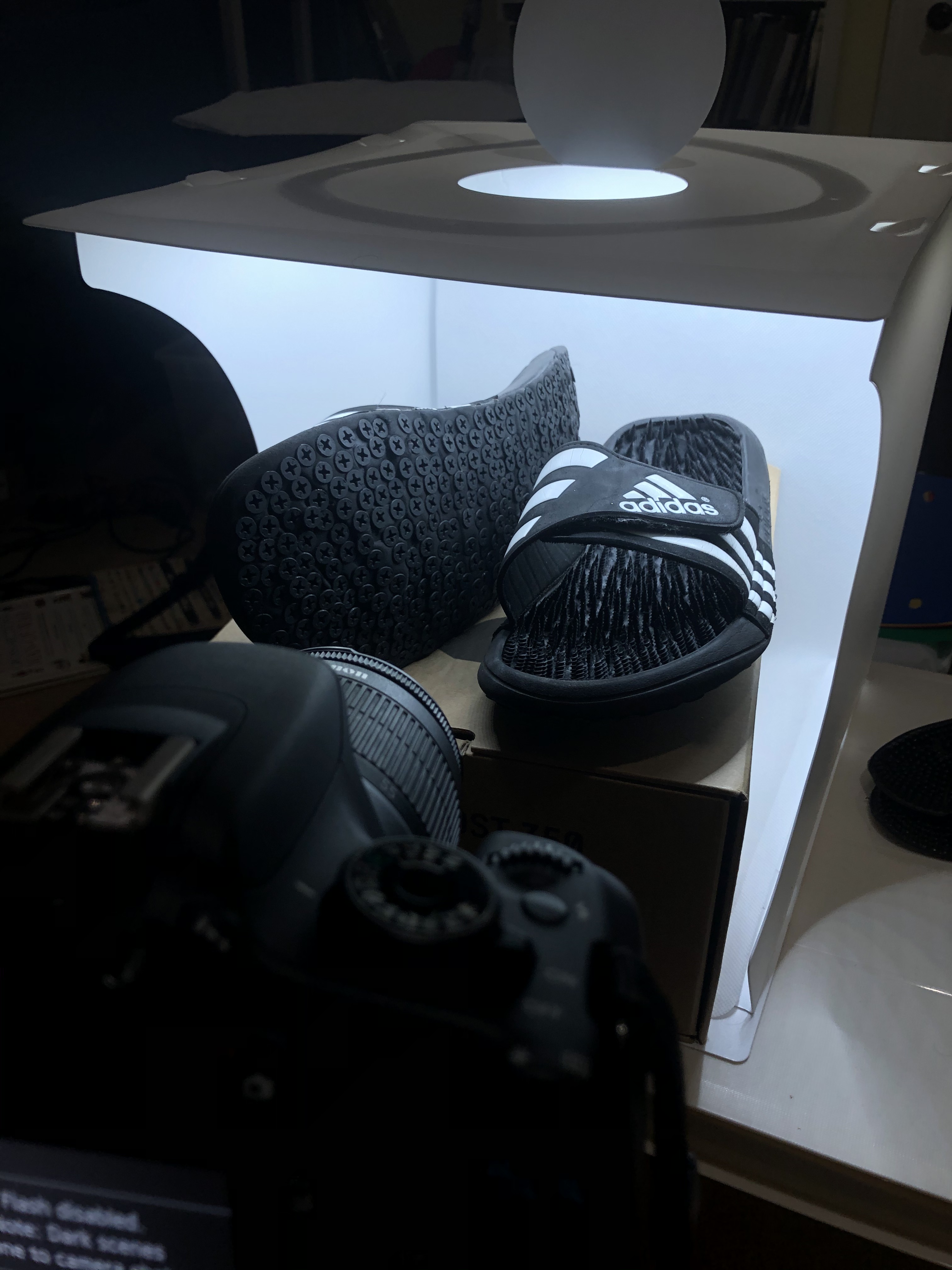 There were several decisions that allowed the Adipuncture shoes to be convincing in their ‘truthiness.’ The first amount of conviction was created through the making of the shoes from old, repurposed Adidas Adisage slides that were no longer in use. The rubber ‘massage’ part was peeled up, and any remnants of glue on the inside of the shoe were painted over with black. Then, in each shoe, one-inch black carpenter screws were hand-drilled into the sole in a regular pattern, making the shoes look identical to their origins. I mimicked the pattern of the original Adidas slide by paying close attention to where each screw went, making sure none were too close or too far from each other, and making them as close to factory-designed as I could. Each shoe has 370 screws into the bottom of them, making 740 screws in total. Each shoe took approximately five or more hours to make, as it was very strenuous to drill each screw into the show. Because the screws are black and are set on an already black shoe, the sandals can hardly be differentiated from the originals. Afterwards, I cleaned the used shoes to make them look new again with their updated functionality. The shoes were then photographed from several angles inside of a lightbox in order to create professional images of the shoes. In addition to this, I recorded a few close-up video clips to incorporate them into a ‘commercial’ that I filmed with the help of my father and grandmother. Of course, my grandma did not put the Adipuncture shoes on in the footage, but another pair of original slides. After recording footage for the commercial featuring my grandmother, I recorded the voiceover script with the help of my father in order to compile them into the commercial. In order to replicate the Adidas branding, I researched their identity and mimicked it to the best of my ability, while also creating a logotype for Adipuncture. My version of the Adidas branding consists of a simple black and white color scheme and the inclusion of the Adidas wordmark, as well as a similar bold sans serif that fit into the identity. The wordmark for Adipuncture is a magenta sans serif that has a fluidity that calls to the action of flesh being punctured with a sharp object. The decision to name the shoes Adipuncture came from a combination of ‘Adidas’ and ‘acupuncture.’ In addition to this, I reference the original shoe name, Adissage, a combination of ‘Adidas’ and ‘massage.’ After creating the branding, I was able to apply it to the video, social media posts, and posters. In their social media, I replicated Adidas’ bio from their original site and replaced their link with my Adipuncture link.