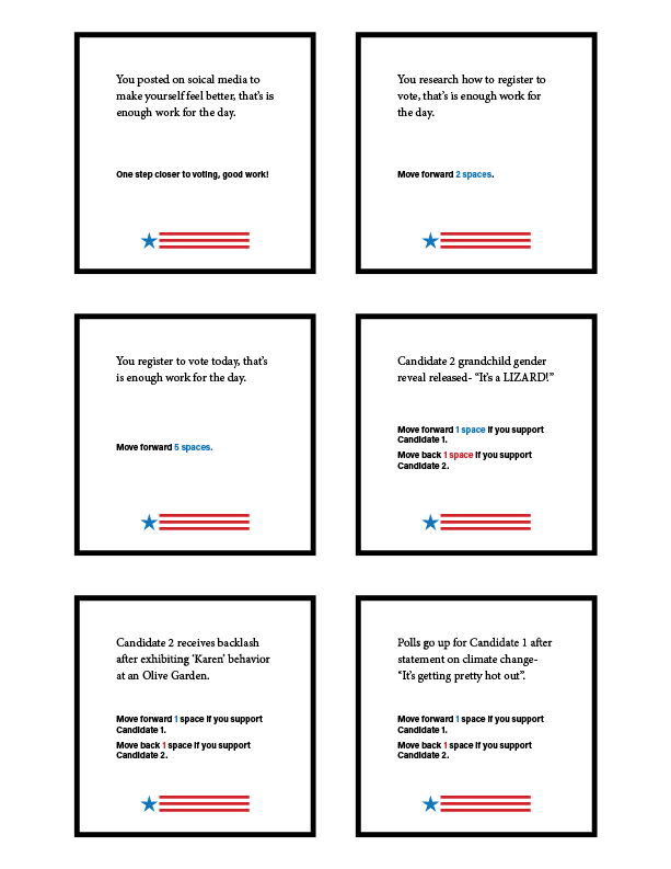 The player spins the wheel in order to move their piece. Depending on the piece, they will flip the respective card and follow its directions. The directions are often playful, such as, “You posted on social media. That’s enough for today,” in regards to those of us whose activism stops at face value.