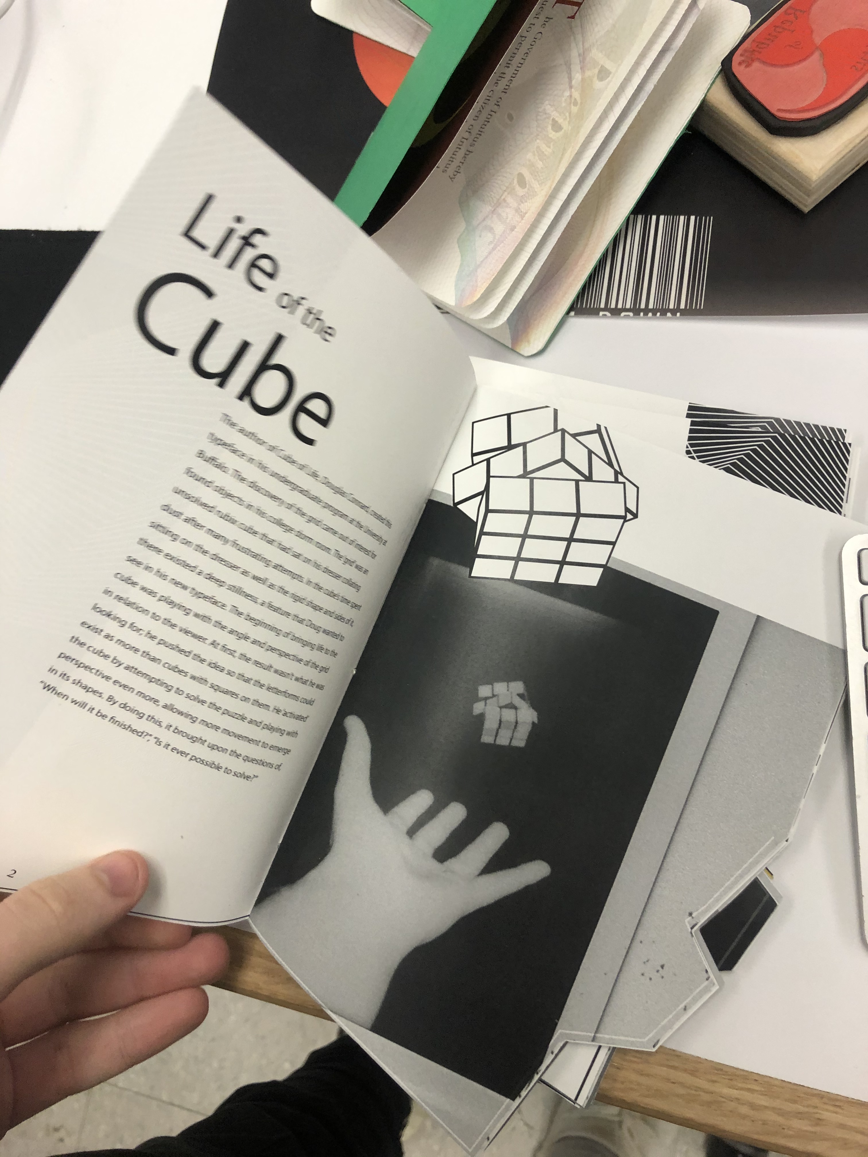 The beginning of bringing life to the cube was playing with the angle and perspective of the grid in relation to the viewer. At first, the result wasn’t what he was looking for; he pushed the idea so that the letter-forms could exist as more than cubes with squares on them. He ‘activated’ the cube by attempting to solve the puzzle and playing with perspective even more, allowing more movement to emerge in its shapes. By doing this, it brought upon the questions of, “When will it be finished?”, “Is it ever possible to solve?”
