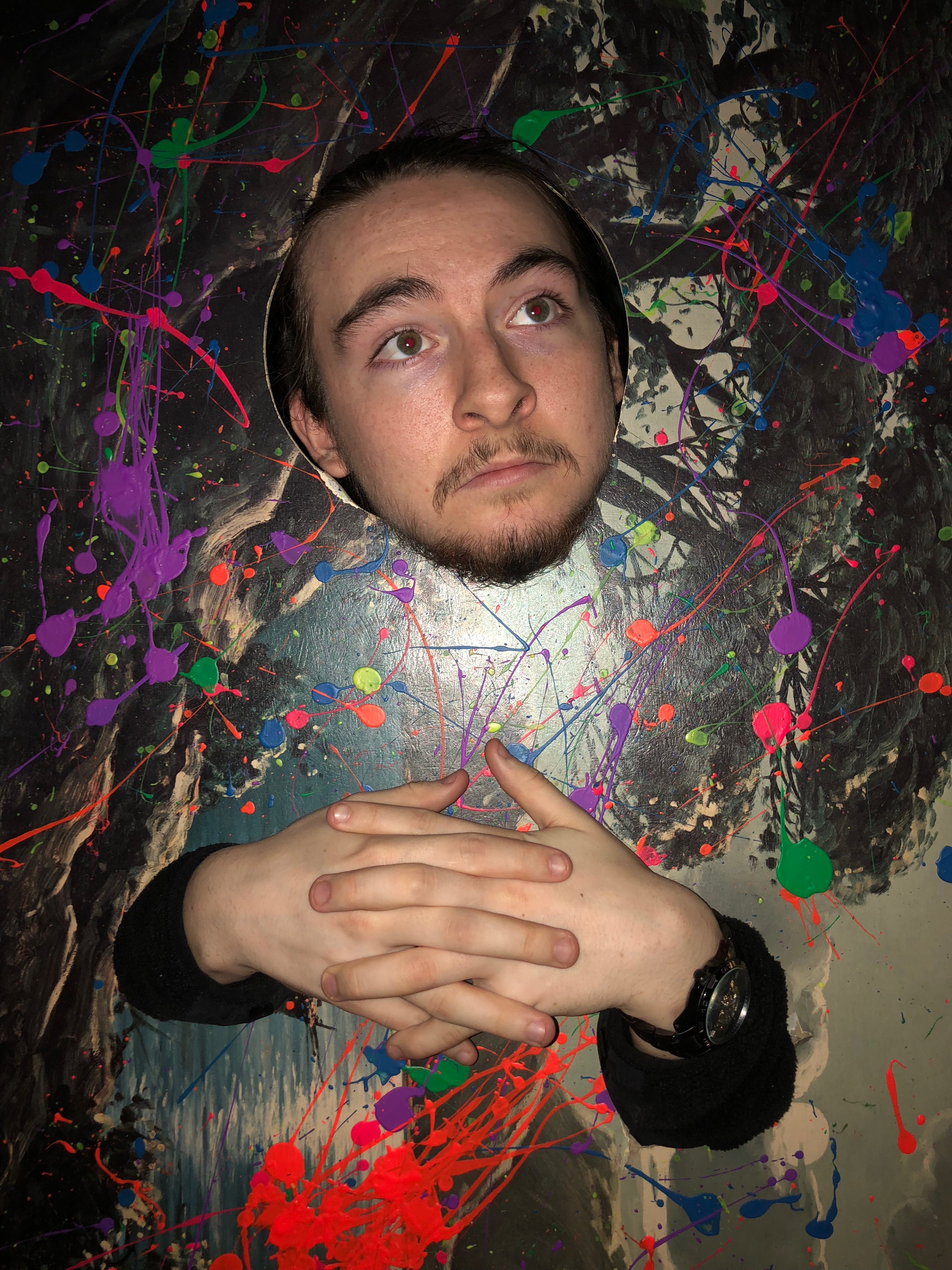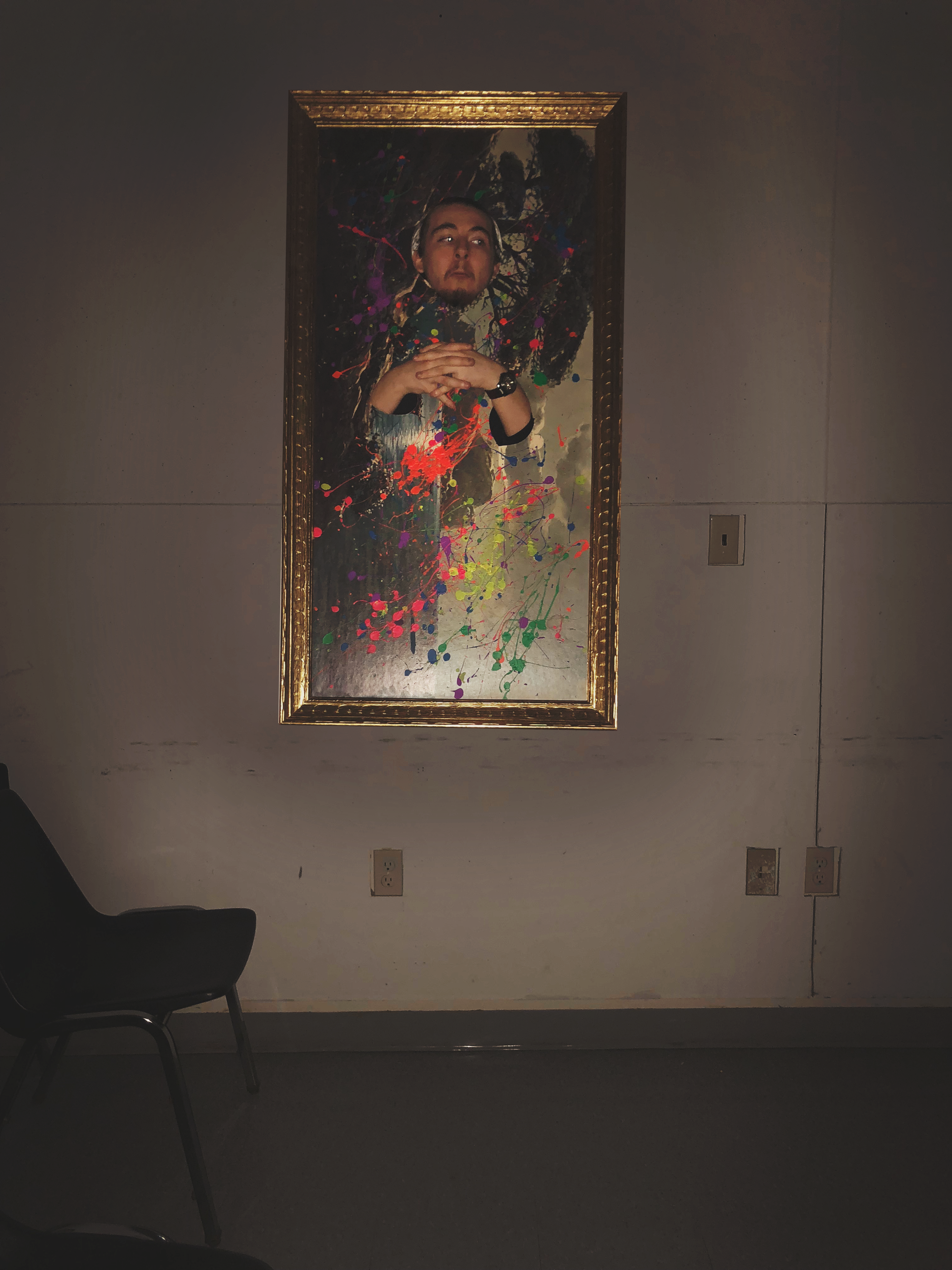 Interruption is a wearable art piece made from a thrifted painting, frame and additional paint. There are many forms of interruption within this work: it is forced to be seen as a skewed landscape turned portrait interrupted by a face and hands along with neon paint splatters.